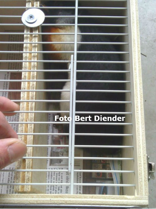 Vanuit de vangkooi de eekhhoorn in een transportkooitje ( loper) laten lopen.